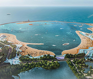 該項(xiàng)目位于月亮灣旅游度假區(qū)海堤外側(cè),以海濱文體旅游綜合體為定位,以2012年四條鯨魚(yú)擱淺新灘鹽場(chǎng)附近事件為引,結(jié)合古黃河文化和海洋文化,構(gòu)建以“鯨魚(yú)沙灘”為主題的IP。